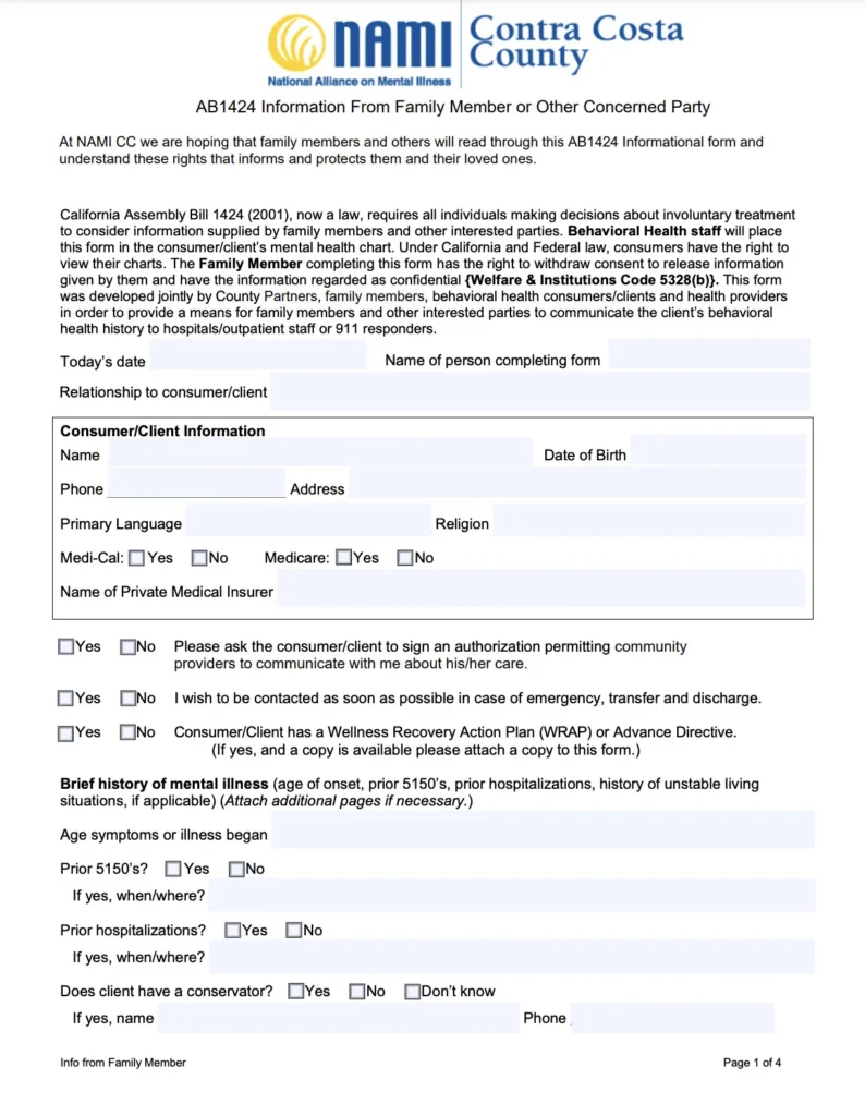 At NAMI CC, we are hoping that family members and others will read through the AB1424 Informational form we provide and understand these rights that informs and protects them and their loved ones. California Assembly Bill 1424 (2001), now a law, requires all individuals making decisions about involuntary treatment to consider information supplied by family members and other interested parties. Behavioral Health staff will place this form in the consumer/client’s mental health chart. Under California and Federal law, consumers have the right to view their charts. The Family Member completing this form has the right to withdraw consent to release information given by them and have the information regarded as confidential {Welfare & Institutions Code 5328(b)}.