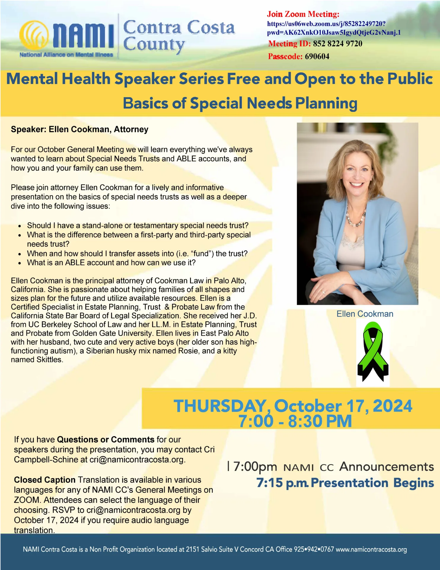 Please join attorney Ellen Cookman for a lively and informative presentation on the basics of special needs trusts as well as a deeper dive into the following issues: