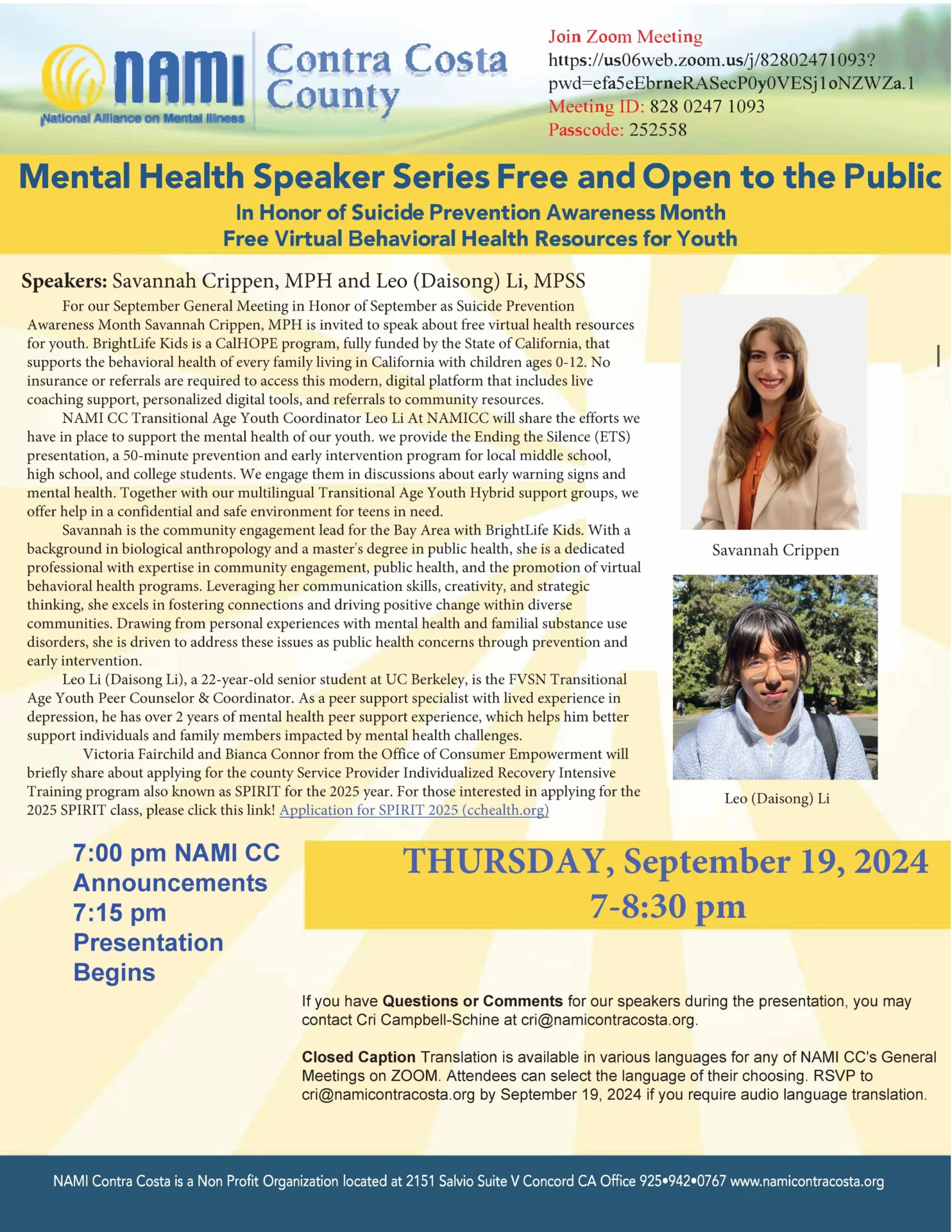 Closed Caption Translation is available in various languages for any of NAMI CC’s General Meetings on Zoom. Attendees can select the language of their choosing. RSVP to gro.atsocartnociman@irc by September 19, 2024 if you require audio language translation.