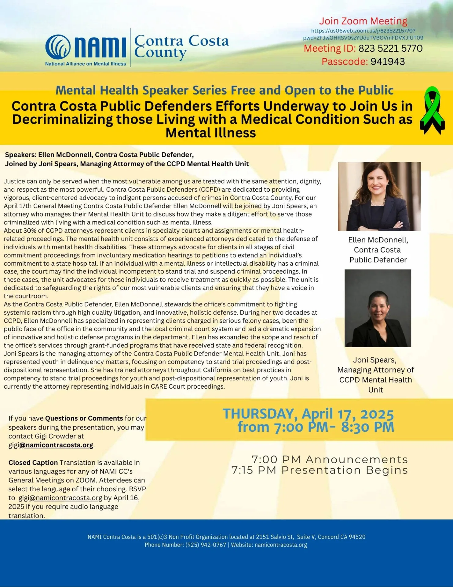 Justice can only be served when the most vulnerable among us are treated with the same attention, dignity, and respect as the most powerful. Contra Costa Public Defenders (CCPD) are dedicated to providing vigorous, client-centered advocacy to indigent persons accused of crimes in Contra Costa County. For our April 17th General Meeting, Contra Costa Public Defender Ellen McDonnell will be joined by Assistant Public Defender Joni Spears who manages their Mental Health Unit to discuss how they make a diligent effort to serve those criminalized with living with a medical condition such as mental illness.