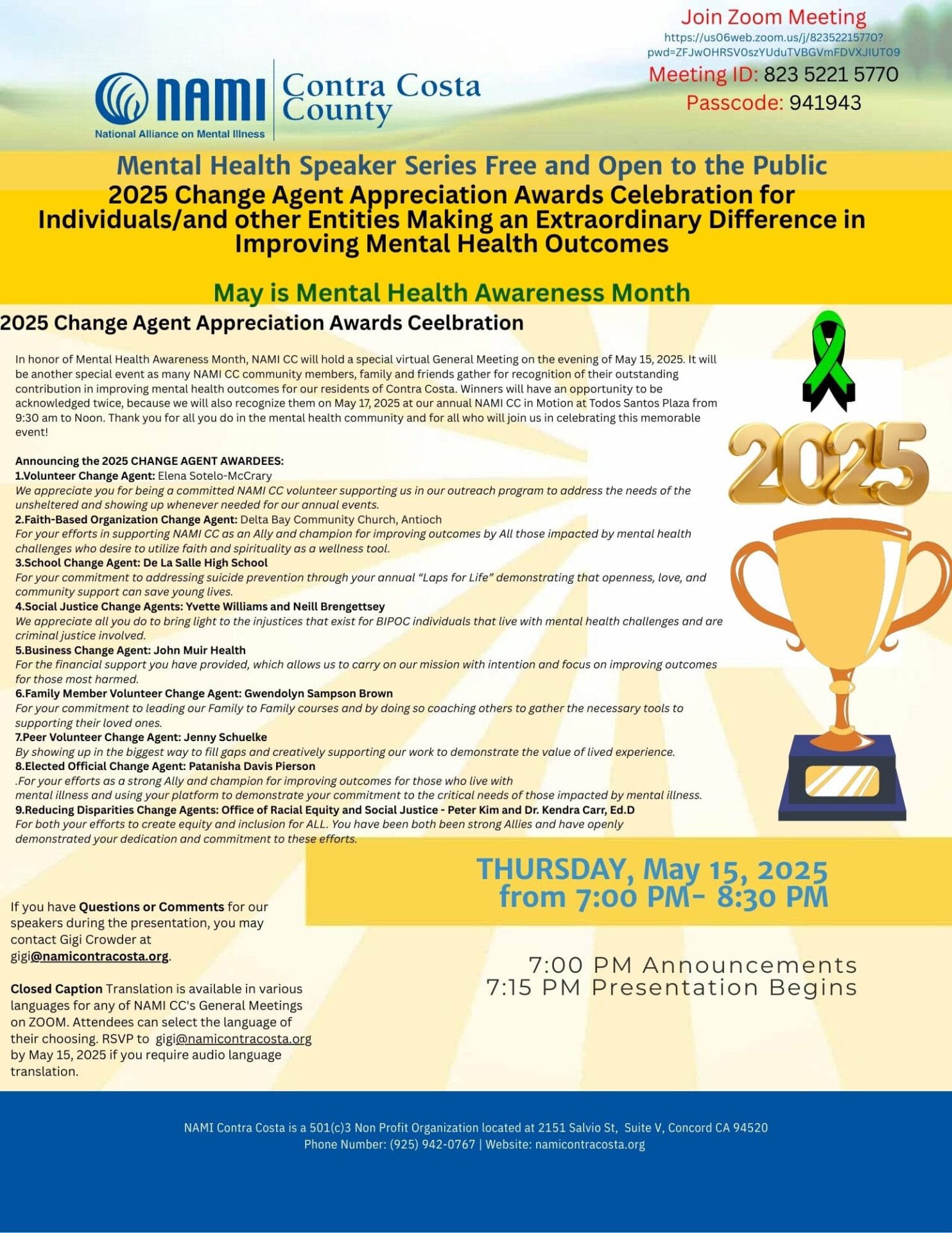 In honor of Mental Health Awareness Month, NAMI CC will hold a virtual General Meeting on the evening of May 15, 2025. It will be another special event as many NAMI CC community members, family and friends gather for recognition of their outstanding contribution in improving mental health outcomes for our residents of Contra Costa. Winners will have an opportunity to be acknowledged twice, because we will also recognize them on May 17, 2025 at our annual NAMI CC in Motion at Todos Santos Plaza from 9:30 am to Noon. Thank you for all you do in the mental health community and for all who will join us in celebrating this memorable event!