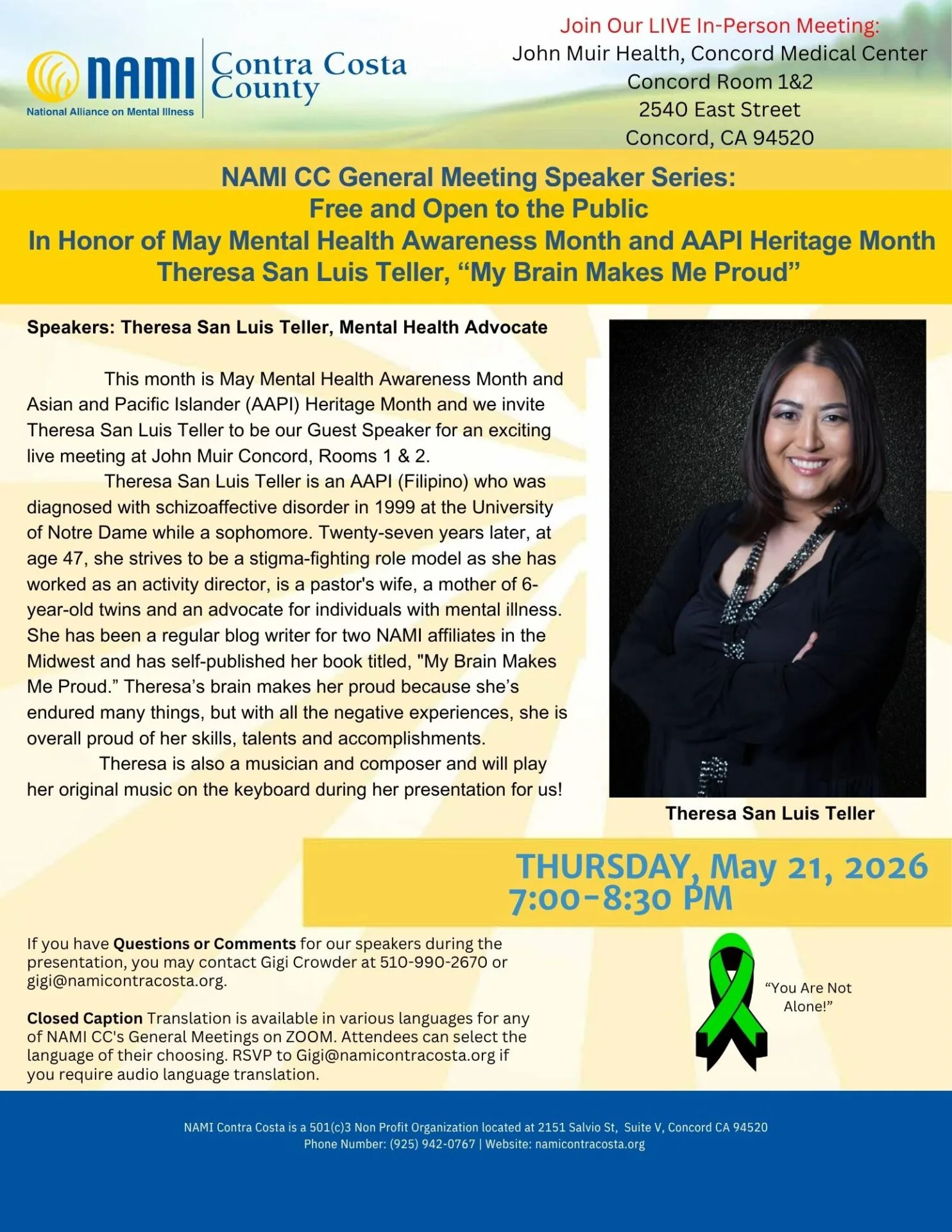 This month is May, Mental Health Awareness Month and Asian and Pacific Islander (AAPI) Heritage Month, and we invite Theresa San Luis Teller to be our Guest Speaker for an exciting live meeting at John Muir Concord, Rooms 1 & 2.