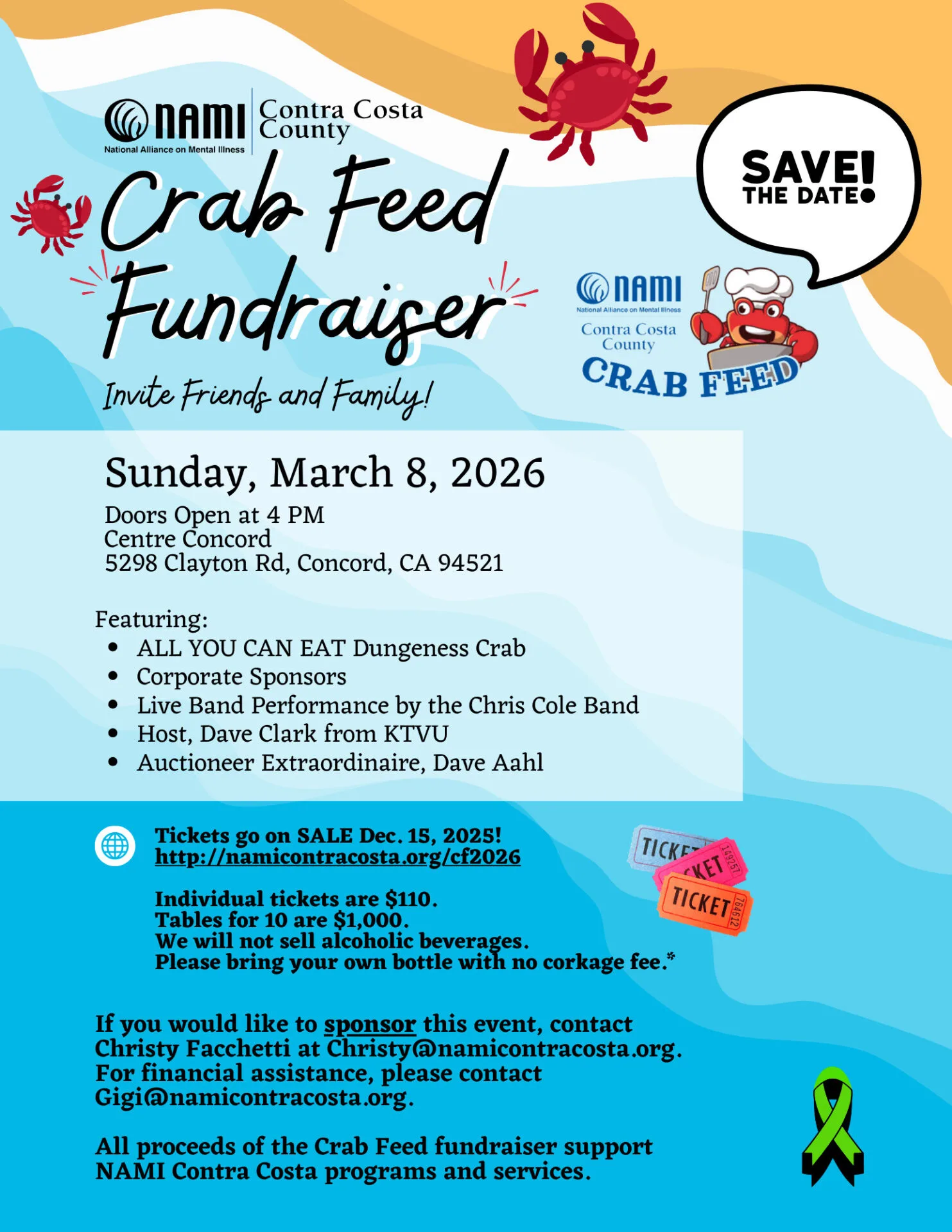 All proceeds of the Crab Feed Fundraiser go towards NAMI CC programs and services. There are NO REFUNDS.