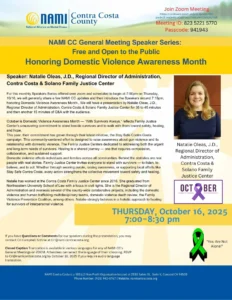 Please be advised that the NAMI CC (National Alliance on Mental Illness, Contra Costa) office will closed on November 7. We will re-open the following Saturday, November 8, 2025.