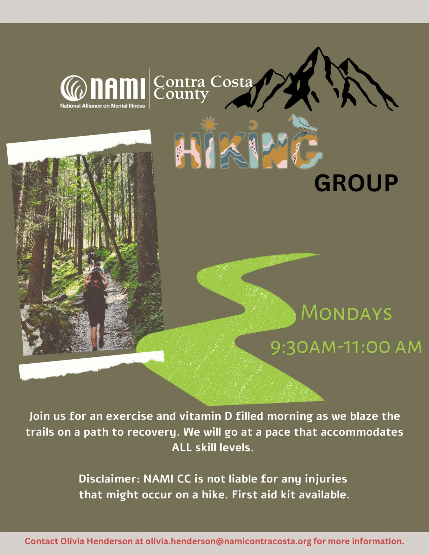 We encourage hikers who wish to gather to do so on their own; however, NAMI CC will be unable to facilitate this group.