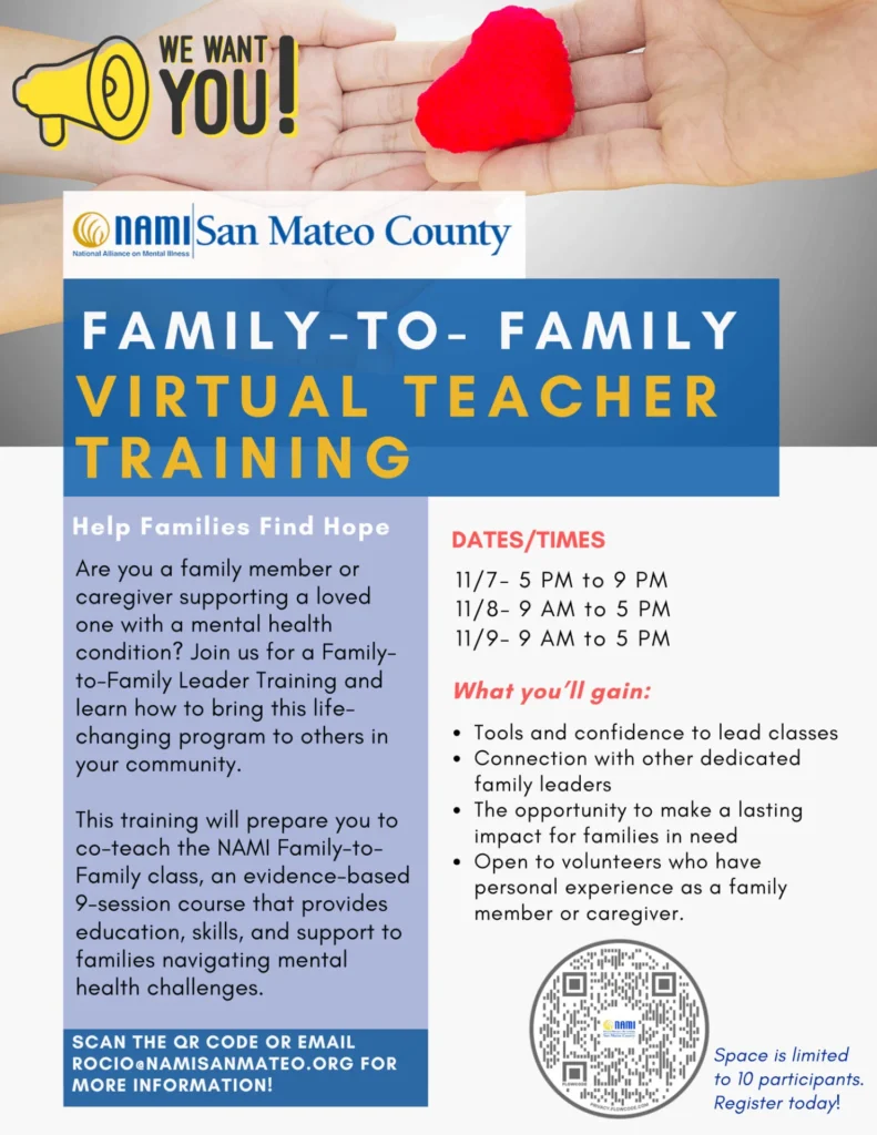 October 3, 2025Help Families Find Hope! You're invited to NAMI San Mateo's Family to Family teacher training in November 2025.